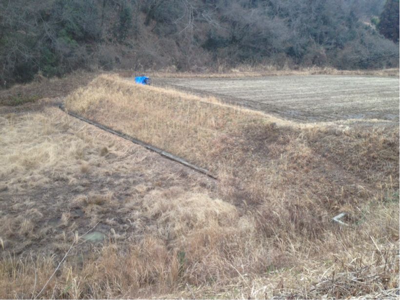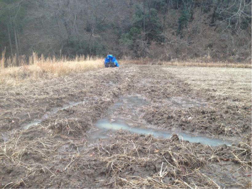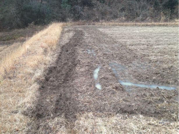 第二圃場で耕運機を走らせた跡。