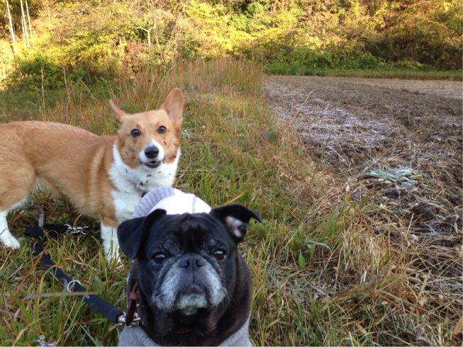 メル(コーギー)とひめ(黒パグ)です。