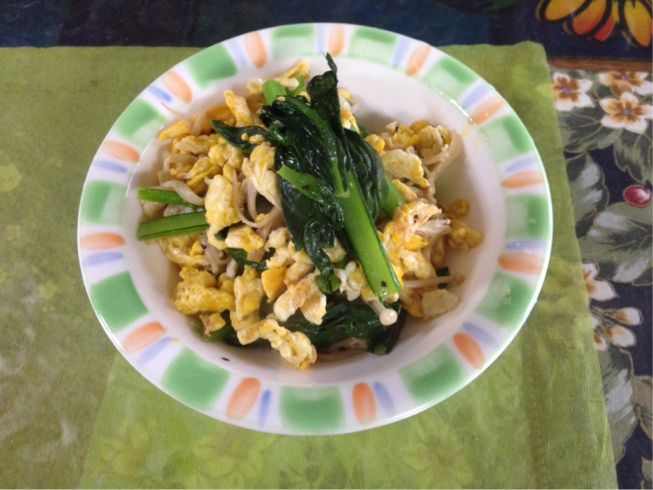最後にエノキをチューブの生姜と炒め、先ほどの卵と小松菜を入れてオイスターソース、塩、胡椒で仕上げて完成ですo(^▽^)o