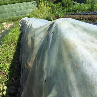 アブラムシが大量発生した畝の横で、不織布に大量のテントウムシの幼虫が‼︎