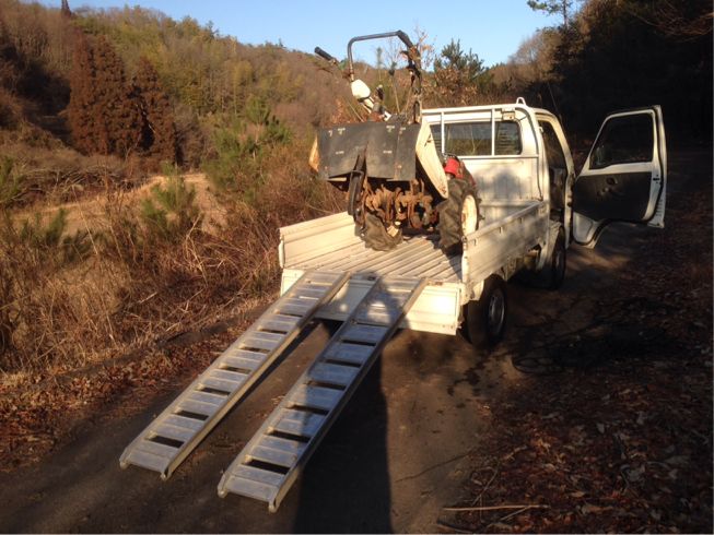 畑へ着きましたが、第一村人すら発見できない山奥での耕運機を荷台から一人で下ろす作業。