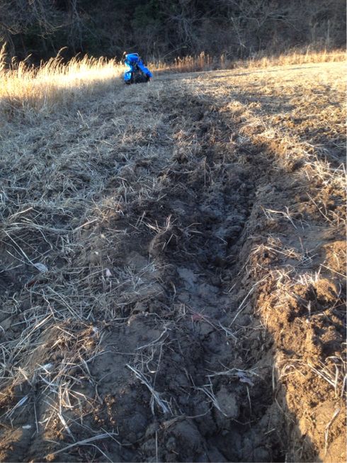 危険な格好ですが無事に畑の上へ。